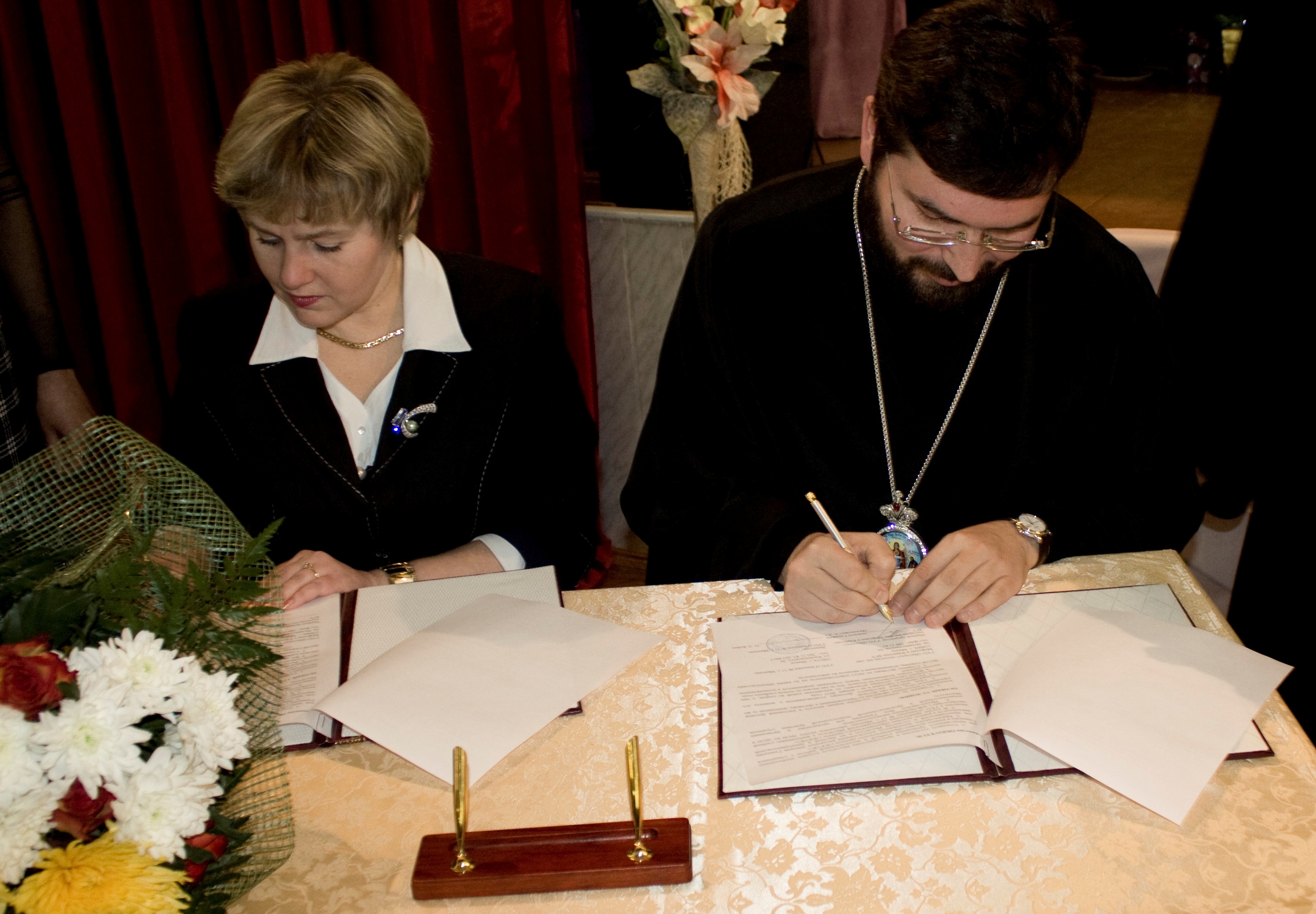 В церемонии подписания договора приняли участие: Преосвященный Серафим, епископ Бобруйский и Быховский, первый проректор Института теологии БГУ; директор гимназии №11 г. Минска О.Л. Бойко; проректор по учебной работе Института теологии БГУ Г.Н. Петровский; руководитель духовно-образовательного проекта «ЛОГОС» С.Г. Рогальский.