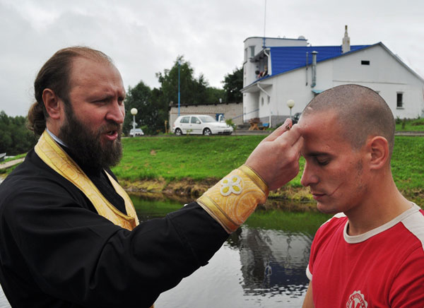 2 июня настоятель прихода в честь Святой Троицы г. Борисова протоиерей Георгий Тюхлов совершил Таинство Крещения при строящемся храме на реке Березина.