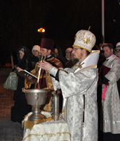 После богослужения владыка Вениамин возглавил крестный ход к Свято-Воскресенскому кафедральному собору, где совершил чин великого освящения воды.