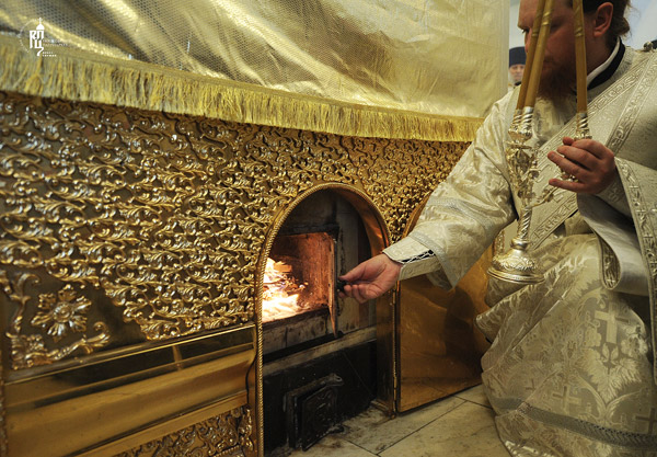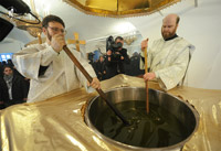 В Великий понедельник после совершения малого водоосвящения Святейший Владыка окропил освященной водой печь, котел, сосуды со специями, вином и маслом, после чего, взяв трикирий, возжег специальные дрова в мироваренной печи. Предстоятель благословил ингредиенты для приготовления святого мира, и в котел были влиты святая вода, вино, елей и добавлены специи.