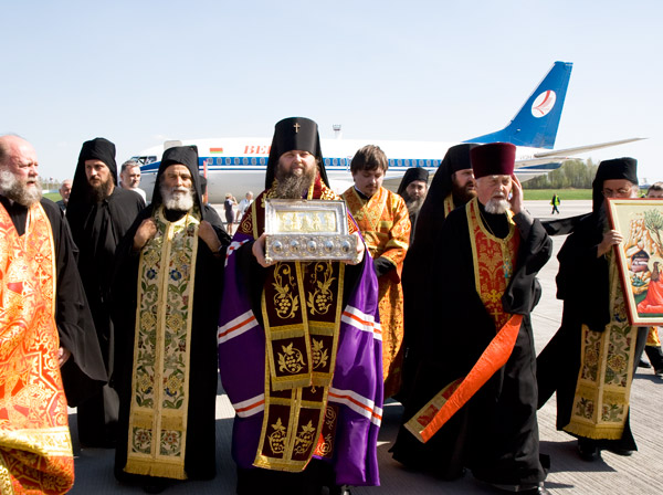 У трапа самолета святыни встретила делегация Белорусской Православной Церкви во главе с управляющим делами Белорусского Экзархата архиепископом Новогрудским и Лидским Гурием. В аэропорту был отслужен краткий молебен, после которого прозвучало приветственное слово от лица афонитов: