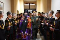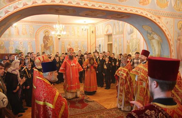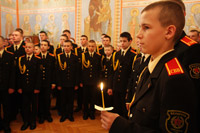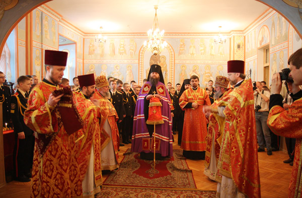 По окончании богослужения Высокопреосвященнейший Архиепископ Гурий зачитал приветственный адрес Митрополита Минского и Слуцкого Филарета начальствующим, учащим и учащимся Минского Суворовского военного училища и вручил церковные грамоты членам администрации и преподавательского состава Суворовского военного училища.