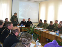 Основные доклады представили заместитель начальника главного управления идеологической работы и кадрового обеспечения, начальник управления идеологической работы пограничной службы РБ полковник С.Л. Байбороша и председатель отдела Белорусского Экзархата по взаимодействию с Вооруженными силами протоиерей Сергий Кузьменков.
