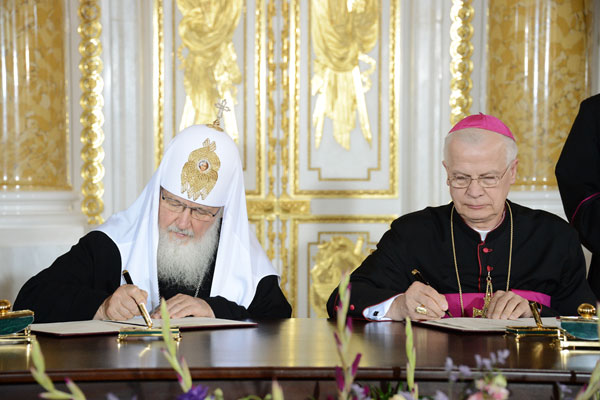 Святейший патриарх Кирилл и председатель Польской епископской конференции митрополит Юзеф Михалик подписали Совместное послание народам России и Польши
