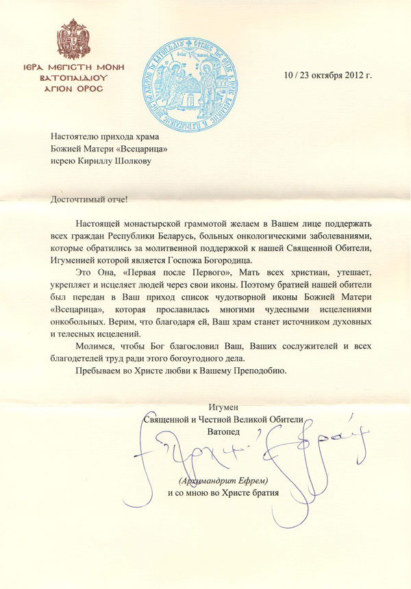 Игумен Святой и Честной Великой Обители Ватопед (Святая гора Афон) Архимадрит Ефрем с братией монастыря постоянно молится за онкологических больных в Беларуси.