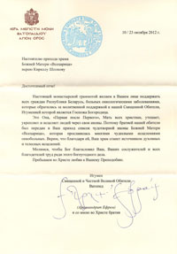 в г.Минске иерею Кириллу Шолкову монастырскую грамоту с поддержкой
