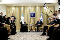 «Ваш визит, Ваше Святейшество, — замечательная возможность выразить глубочайшее уважение, которое мы питаем к православной вере», — отметил Президент. Он подчеркнул, что Государство Израиль готово сделать все для того, чтобы обеспечить православным и представителям других религий возможность в мире и безопасности жить и молиться на этой земле в соответствии с их установлениями.