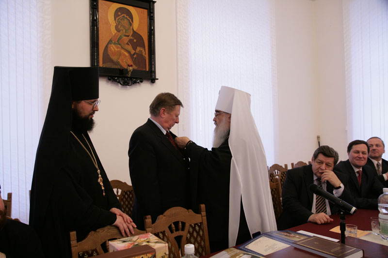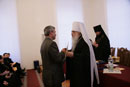 Прозвучали приветствия и были вручены подарки главным духовным школам в Беларуси представителями Московских духовных академии и семинарии прот. Владиславом Цыпиным, Киевских духовных академии и семинарии прот. Владимиром Коцаба, Одесской духовной семинарии прот. Андреем Сулаковым, Ректором Гродненского Государственного медицинского университета Гареликом Петром Васильевичем, Уполномоченным по делам религий и национальностей при Совете Министров Республики Беларусь Гуляко Леонидом Павловичем , председателем Слонимского райисполкома Павлюкевичем Иосифом Осиповичем.