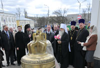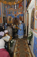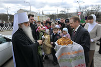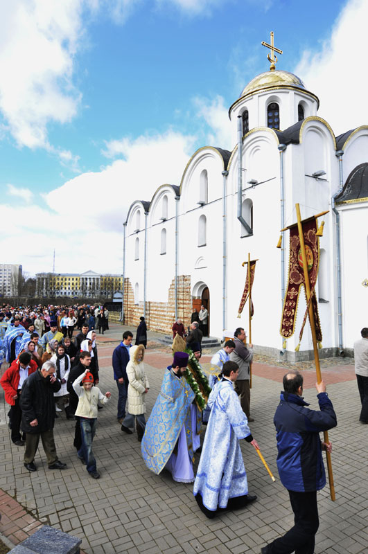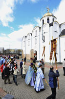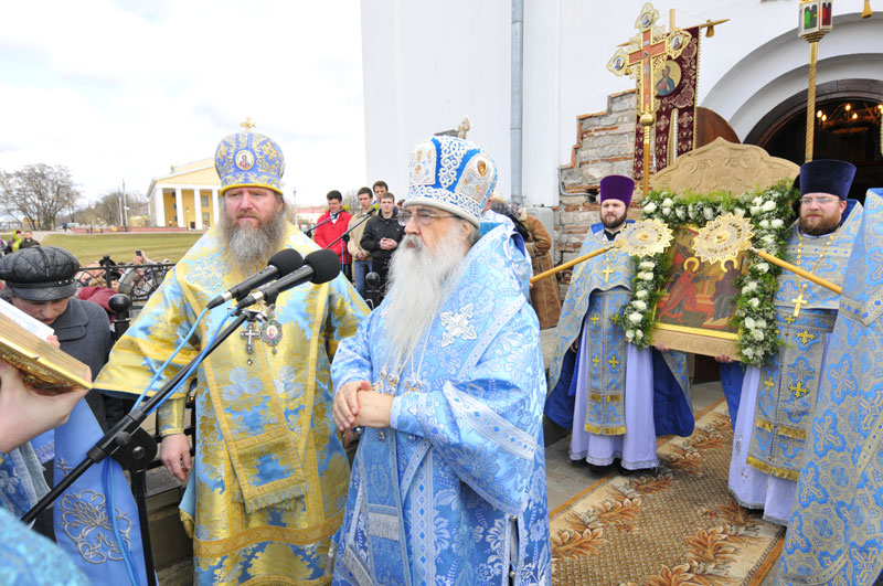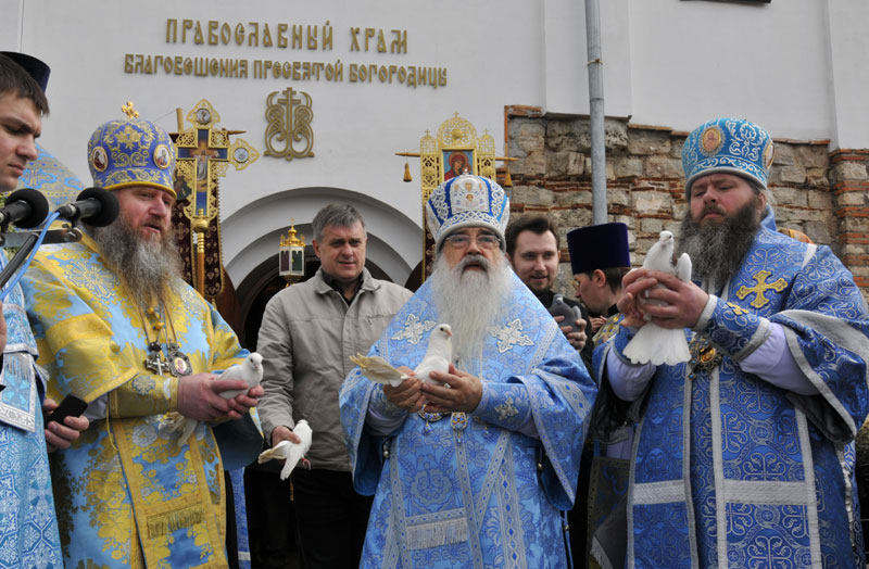 По окончании Литургии состоялся крестный ход вокруг древнего Благовещенского храма XII века. По сложившейся уже традиции Владыка Экзарх вручил в дар приходской библиотеке Библию в кожаном переплете, а на паперти храма в небо были выпущены белые голуби — символ благовестия о спасении рода человеческого.