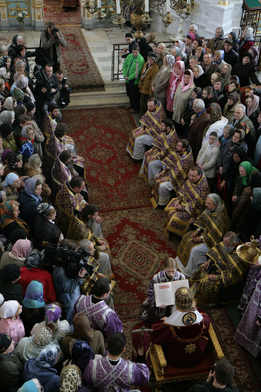 выходят священнослужители, принимающих участие в чине. В это время хор