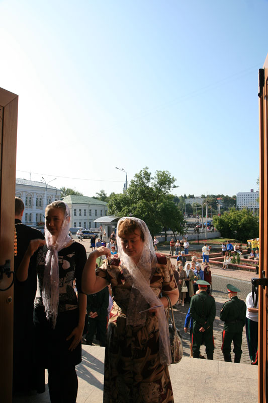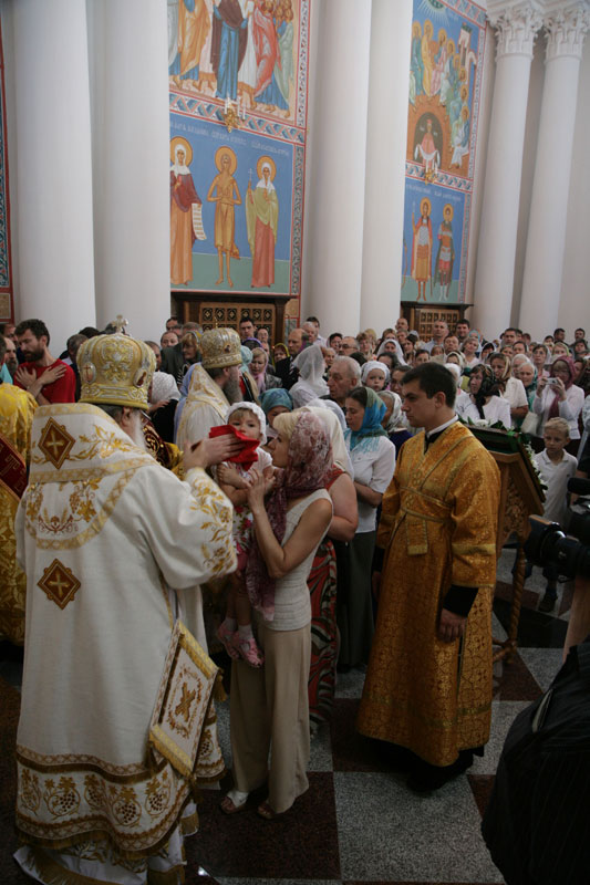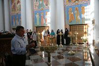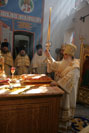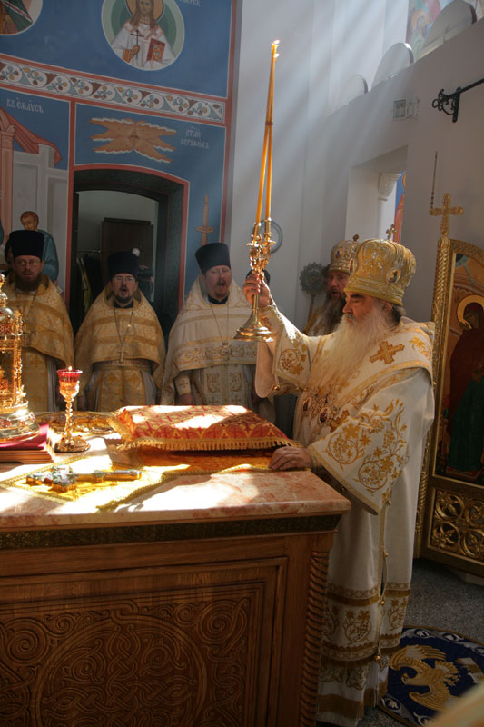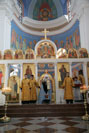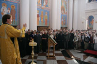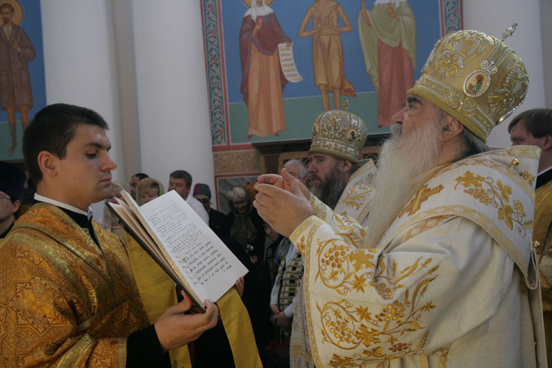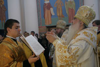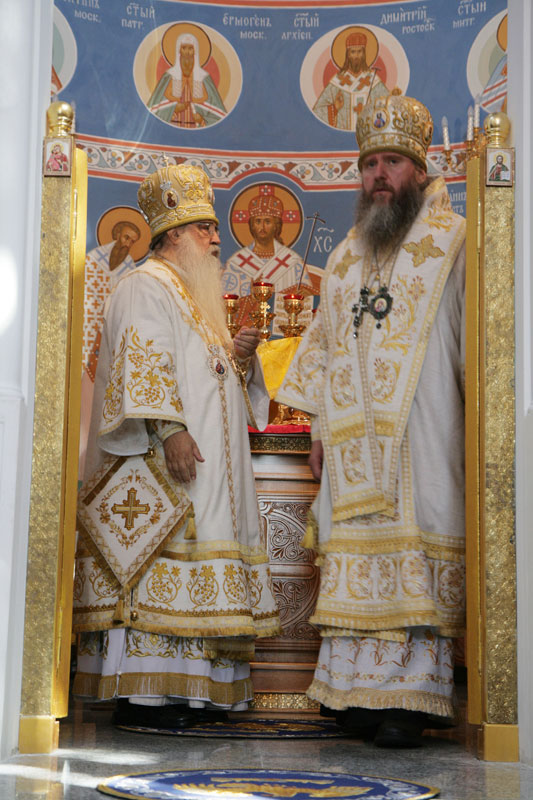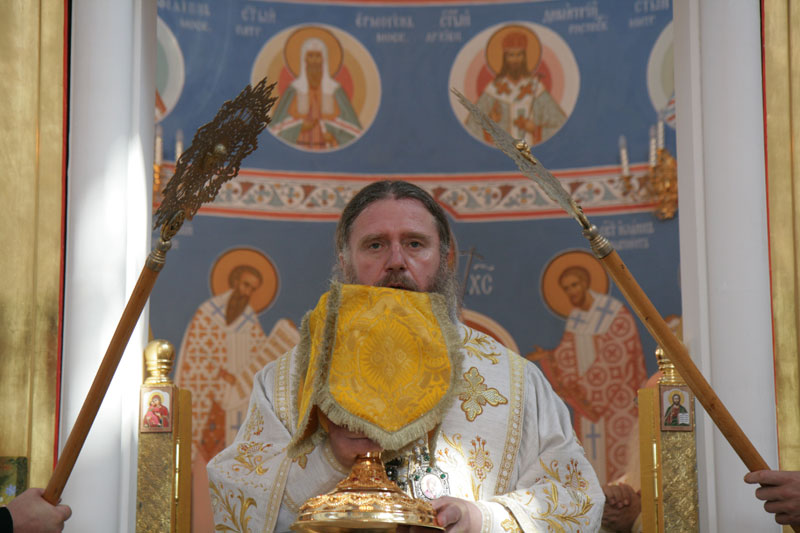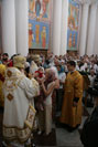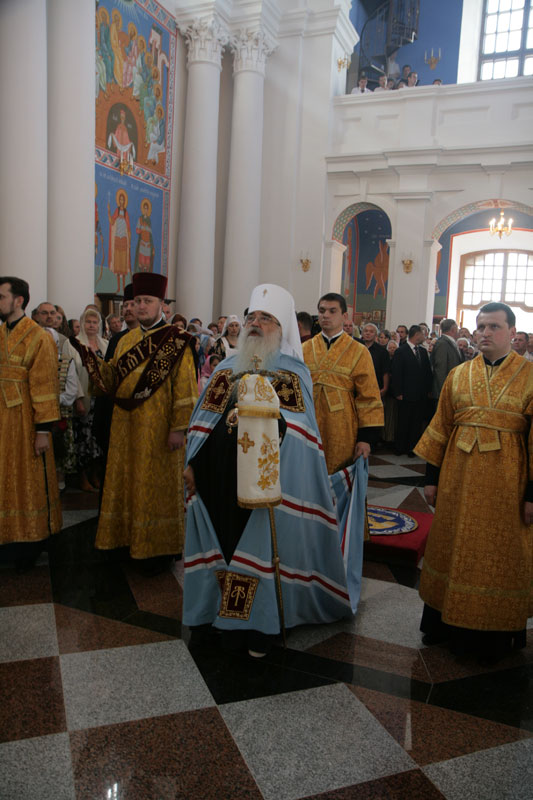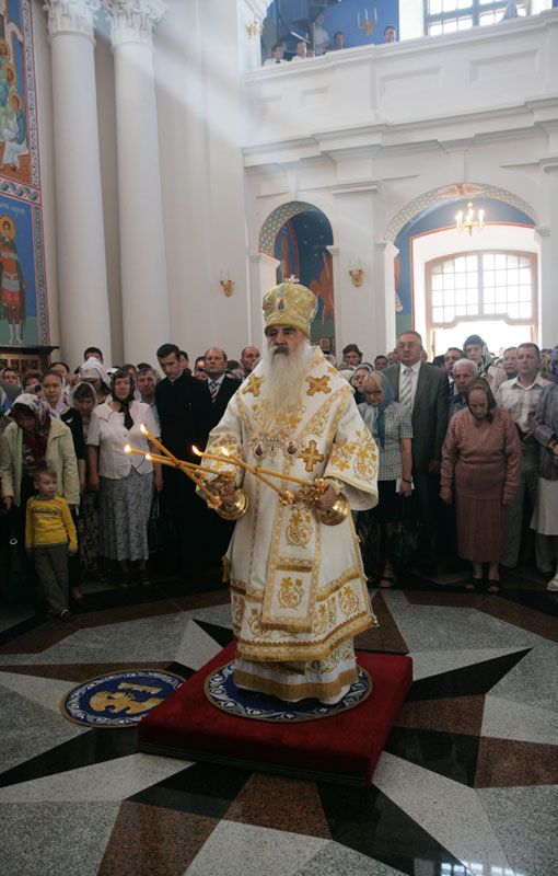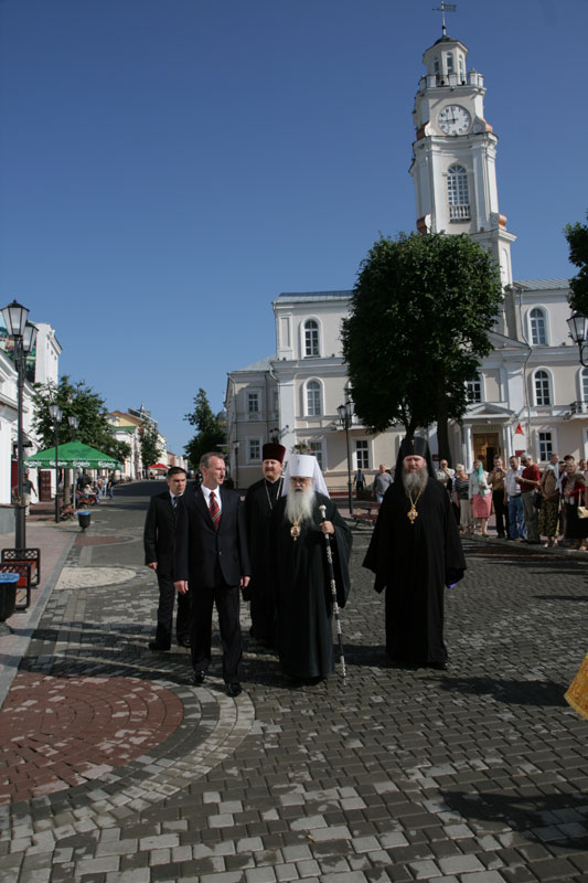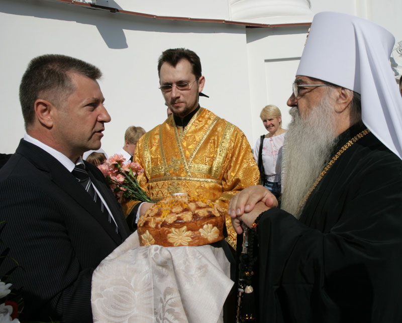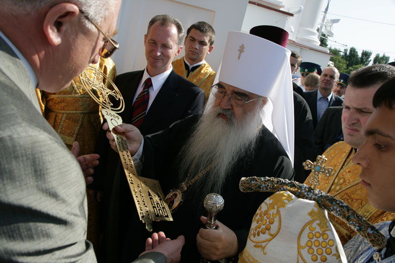 Перед началом службы губернатор Витебской области Александр Косинец вручил Патриаршему Экзарху символический ключ от вновь воссозданного храма города Витебска.