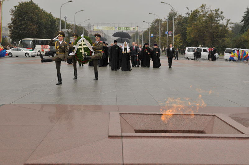 Патриарха Кирилла и членов делегации встречал исполняющий обязанности мэра Минска Н.А.Ладутько. Военный оркестр исполнил торжественные мелодии. Поднявшись по ступеням, Высокий гость возложил венок к обелиску и почтил погибших в годы Великой Отечественной войны.