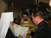 Матери «Знамение» и обратился к участникам торжеств с приветственным словом. В память годовщины Владыка Митрополит передал Свято-Никольскому