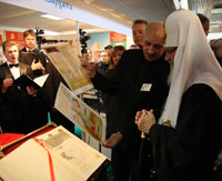 Предстоятель Русской Православной Церкви, в частности, ознакомился со стендом Издательства Белорусского Экзархата.