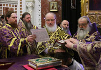 Святейший Патриарх Кирилл поздравил Митрополита Филарета с 75-летием со дня рождения. Святейший Владыка огласил поздравительный адрес и Указ о награждении за заслуги перед Русской Православной Церковью и в связи с 75-летием со дня рождения Митрополита Минского и Слуцкого Филарета, Патриаршего Экзарха всея Беларуси правом служения с предносным крестом в пределах Белорусского Экзархата. Святейший Патриарх Кирилл подарил Владыке Филарету комплект из креста и двух панагий.