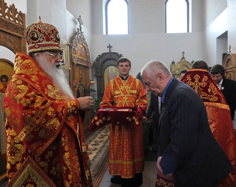 За богослужением Патриарший Экзарх вручил ряд церковных наград особо потрудившимся на приходе в честь святителя Николая Чудотворца.