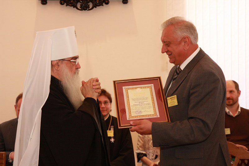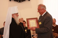 Далее к аудитории обратился со словом Митрополит Филарет, выразив перед выступлением благодарность руководству НАН за поздравления и высокие награды. Окончив выступление, Его Высокопреосвященство вручил М.В. Мясниковичу во внимание к усердным трудам во славу Церкви Божией Орден свт. Кирилла Туровского.