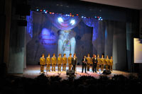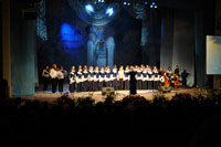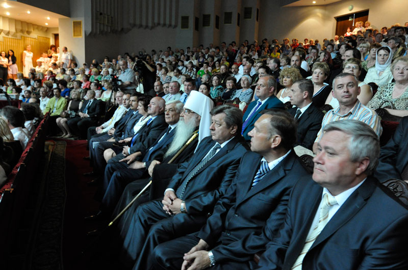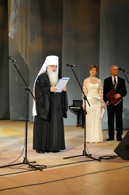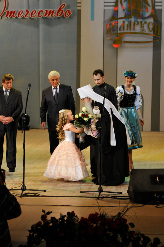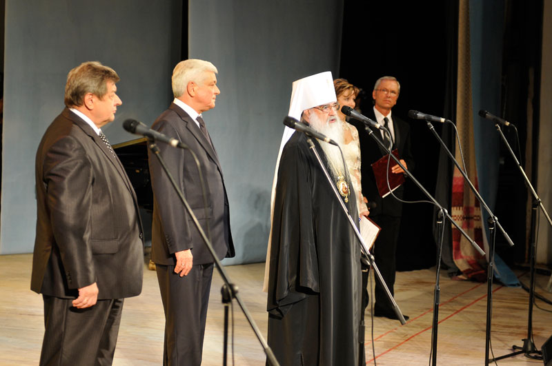 Его Высокопреосвященство возглавил торжественное собрание и присутствовал на праздничном концерте в рамках закрытия акции «Семья – Единение – Отечество». Владыка Филарет обратился с приветственным адресом ко всем присутствующим и передал в дар жителям молодеченской земли экземпляр факсимильного издания Слуцкого Евангелия.