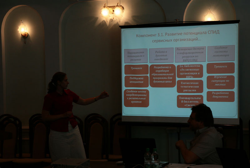 Далее директор Межконфессиональной миссии предоставил слово координатору программы ММ «ХСС» по ВИЧ Анастасии Кривицкой, которая сообщила о достижениях программы (организация тренингов для социальных работников и т.д.) и близких перспективах (разработка программы по ВИЧ для духовных учебных заведений, получение доступа к светским информационным ресурсам).
