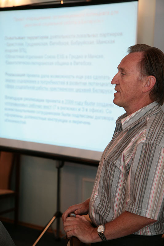 О действии программы «Наращивание организационного потенциала для церковных социальных организаций Беларуси» рассказал ее координатор Александр Шевчук. Программа включает в себя изучение опыта локальных партнеров в регионах, содействие развитию материально-технической базы церковных социальных структур, проведение образовательных мероприятий.