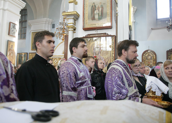 Божественную литургию, диаконскую и иерейскую хиратонии в Свято-Духовом кафедральном соборе г. Минска совершил Высокопреосвященнейший Митрополит Филарет. 2 октября 2011 г.