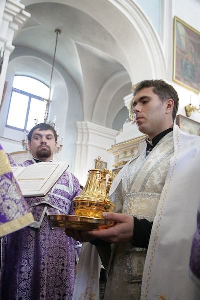Божественную литургию, диаконскую и иерейскую хиратонии в Свято-Духовом кафедральном соборе г. Минска совершил Высокопреосвященнейший Митрополит Филарет. 2 октября 2011 г.